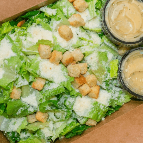 Hearty romaine lettuce with crunchy croutons, creamy Caesar sauce, and flavorful Parmesan cheese